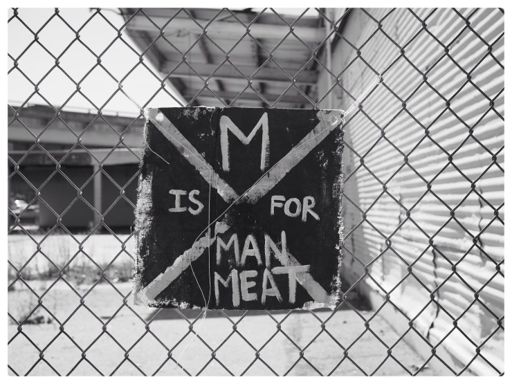 #California #SanFrancisco #streetphotography #sign #foundart #mono #blackandwhite #lines #graphic #handwritten #diagonal #M #MisforManMeat #cannibals #dystopian #somepeople