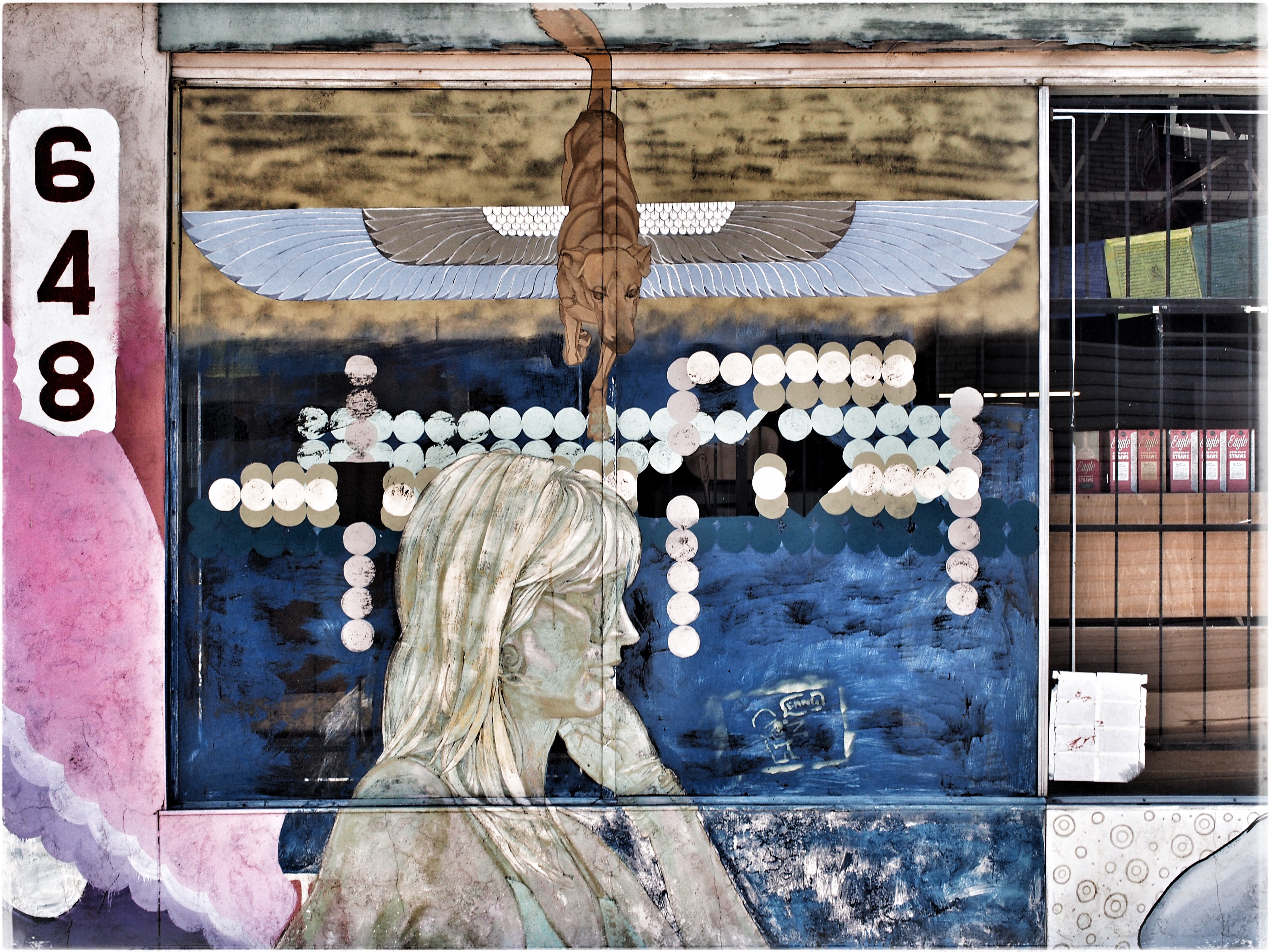 #California #Fresno #Downtown #mural #graffiti #woman #dog #Egyptian #dogwithwings #numbers #streetphotography #store #storefront