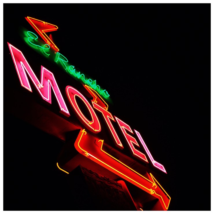 #California #CentralValley #Highway99 #ElRancho #ElRanchoMotel #motel #sign #signgeeks #old #neon #night #light #arrow #signswitharrows #red #green #black #midcenturymodern