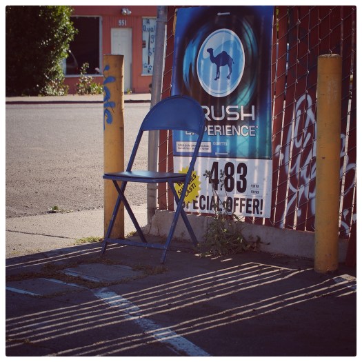 Posted on December 24, 2015Blue Chair #California #BayArea #urban #streetphotography #camel #advertising #shadows #blue #yellow #red #emptychairproject #emptychairsproject Share this: Share on X (Opens in new window) X Share on Facebook (Opens in new window) Facebook Like Loading...