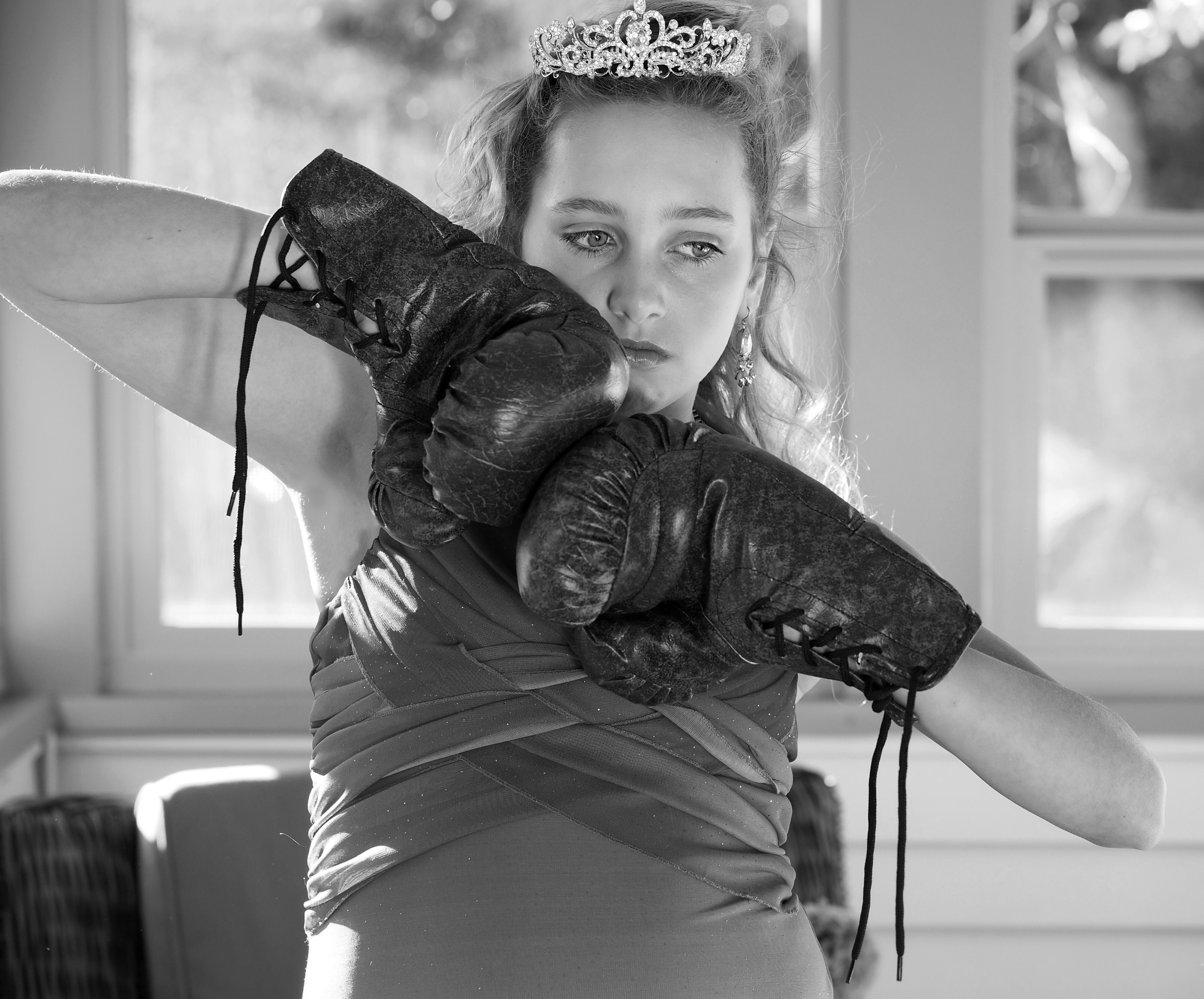 … #child #princess #boxinggloves #toughgirl #tiara #crown #bwphoto #blackandwhitephotography #naturallightphotography #mood #windowlight